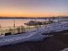Sun rises over a snowy winter morning on the Mississippi River as the riverboats sit idle.
