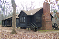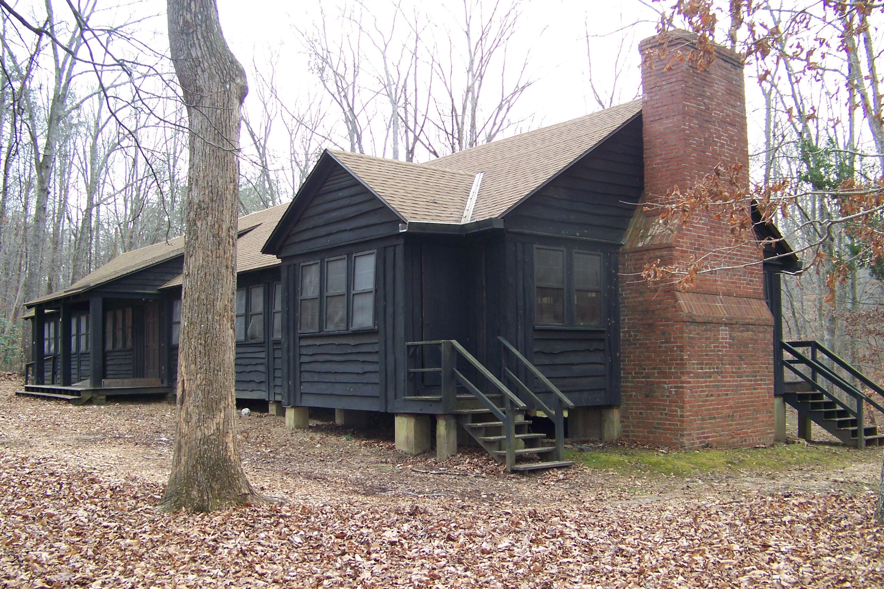 Exterior of cabins in historic cabin camps at Prince William Forest Park. Don by day loabor crew at Prince William Forest Park.