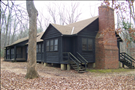 Image of the exterior at Cabin Camp 3 Dining Hall showing the freshly stained building