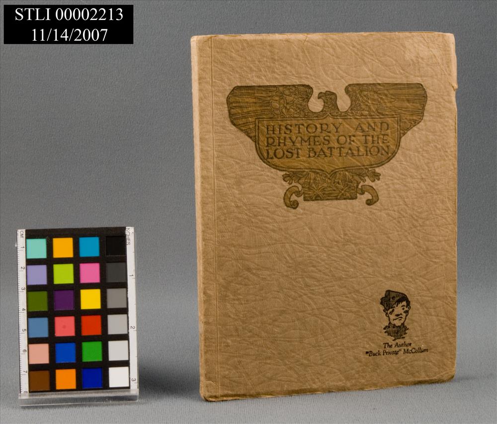 SUBJECT: LOST BATTALION, 77TH LIBERTY DIVISION, UNITED STATES ARMY<CRITEM: BOOK<CROWNER: MRS. P.E. THOMAS<CRTITLE: HISTORY AND/RHYMES OF THE LOST BATTALION<CRAUTHOR: "BUCK PRIVATE" McCOLLUM/WRITER AND FRANKLIN SLY/ILLUSTRATOR<CRTOPIC: HISTORY OF THE BATTALION AND POETRY ABOUT WORLD WAR SOLDIERS<CRFORMAT: ENGLISH. SOFT COVER. 80 PAGES. BROWN COVER. TITLE IS PRINTED WITHIN AN EAGLE DESIGN ON THE FRONT COVER. A CARTOON ILLUSTRATION OF A WORLD WAR I SOLDIER AND THE AUTHORS NAME IS IN BLACK ON THE LOWER RIGHT CORNER OF THE FRONT COVER. THE TEXT IS IN BROWN PRINT AND ACCOMPANIED WITH ILLUSTRATIONS. A LETTER IS AT THE END FROM THE AUTHOR. ADHERED TO THE TITLE PAGE HAS A RED, BLUE AND WHITE STICKER. THE STICKER HAS THE EMBLEM OF THE AMERICAN LEGION, A POST NAME AND A DEDICATION. THE TITLE PAGE HAS A SMOOTH SURFACE, AND PULLS OUT. THERE ARE TWO BLACK AND WHITE PHOTOGRAPHS ON THE PULL OUT-- CHARLES W. WHITTLESEY AND THE OFFICIAL PHOTOGRAPH OF THE BATTALION. TWO STAPLES'