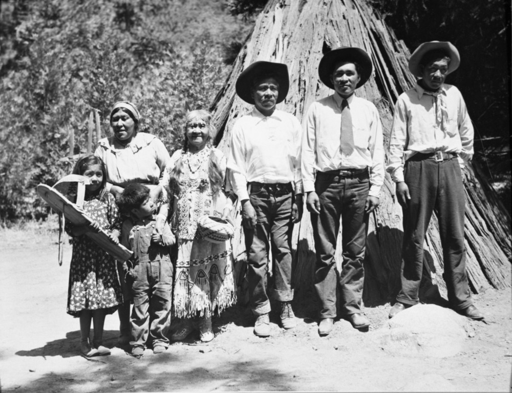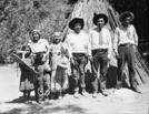 Playing hand game in Yosemite Valley. L to R: Sally Ann (South. Miwok), Maggie Howard (Mono Lake Paiute), Grace Anker (S. Miwok), & Bill Tadd (Cen. Miwok).