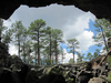 A cave opening makes a wide arc over a rubble floor and frames a stand of tall pine trees below a cloudy sky.