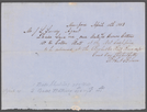 On front of document: "Mumford April 11th 1853 Mr J L Lundy Agent Please Send me one Bale 4/4 Brown Cottons 150 lb Cotton Bats at the Net Cash Price to be delivered at the Rochester Rail Road depot Yours Very Respectfully Robert Brown” Note in pencil "1 Bale Sheeting 750 yds April 15 2 Bales Batting 49 lbs & 51 11 [cts?] 100 lbs" On back of document: "R Brown Mumford"