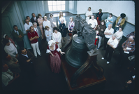 Independence Hall. Interior. Tower Stairhall. Looking down northwest at 1st floor. Tour guide in period costume showing visitors the Liberty Bell.