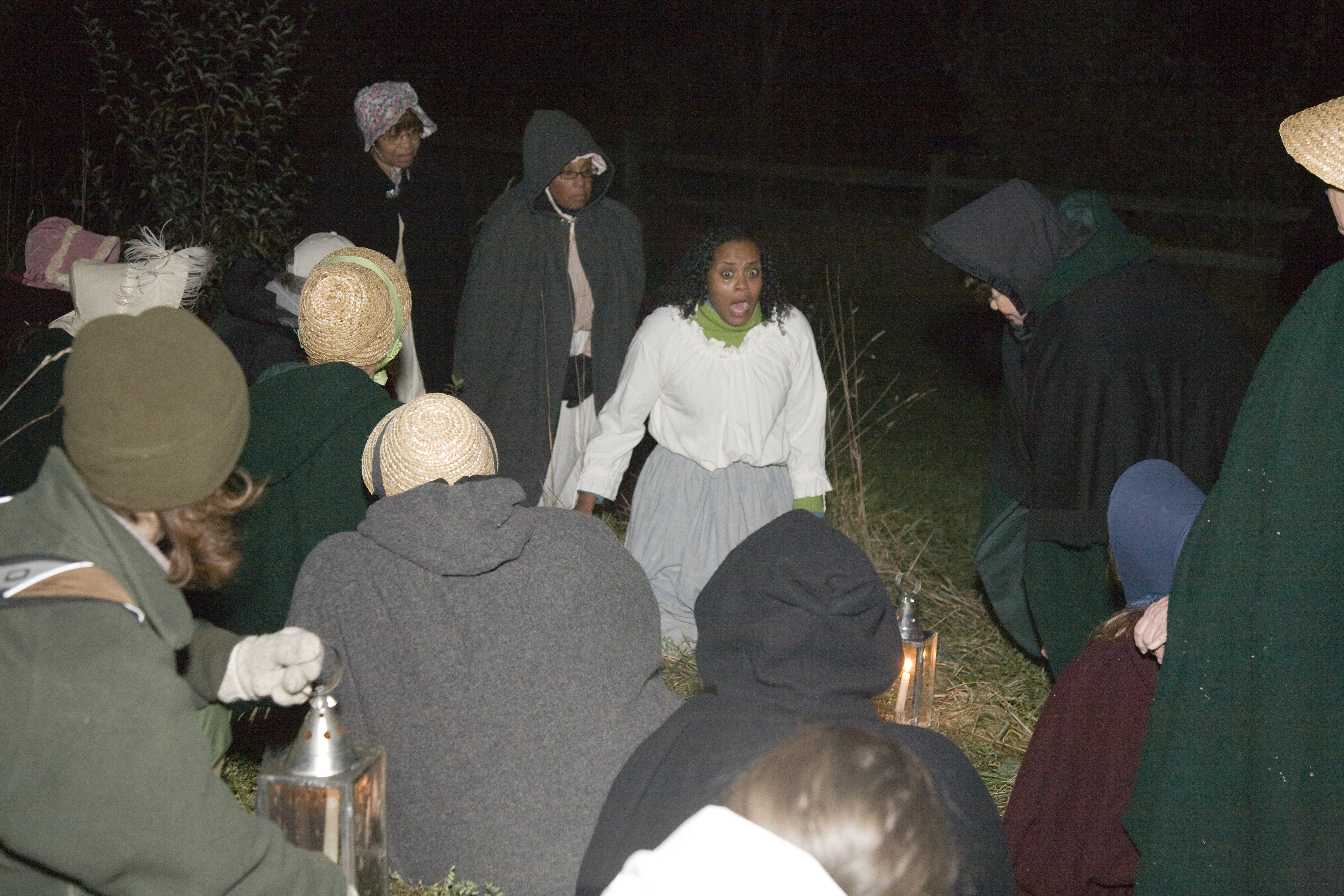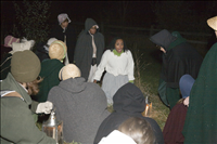Volunteers practive their roles in a scene where a runaway slave is captured. || Cuyahoga Valley National Park interprets Ohio's Underground Railroad heritage because the centerpiece or our park, the Ohio & Erie Canal, was a likely route traveled by runaway slaves. Experience the Underground Railroad, offered each November, places visitors in the role of an escaping slave. The program is part of the National Underground Railway Network to Freedom which recongnizes historic sites, facilities, and programs that have a verifiable association to the Underground Railroad. The photos show volunteers at the dress rehearsal.