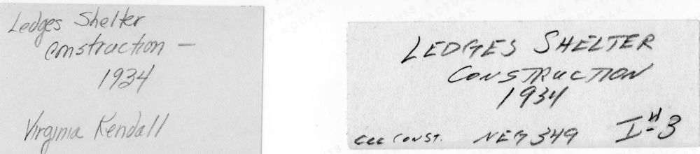 Construction of Ledges Shelter by Civilian Conservation Corps ca. 1934. See scan of writing on the back of each image for additional details. || Many of the historic structures in the Virginia Kendall unit of Cuyahoga Valley National Park were built by Civilian Conservation Corps workers during the 1930s.