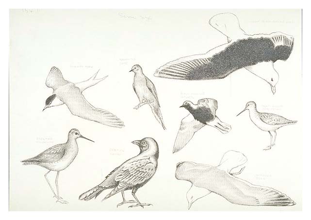 Spring and Summer birds of Cape Cod: Common tern, Mourning dove, Great Black-backed gull, Greater yellowlegs, Common crow, Black-billed plover, Short-billed dowitcher, and Herring gull.