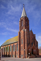 This imposing Gothic Revival church was built of locally quarried Jacobsville sandstone in 1900 for a growing French-Canadian Catholic population. It was deconsecrated in 1966 after the population of Calumet decline when the mines closed. The Keweenaw Heritage Center has conducted restoration efforts of the structure.
