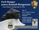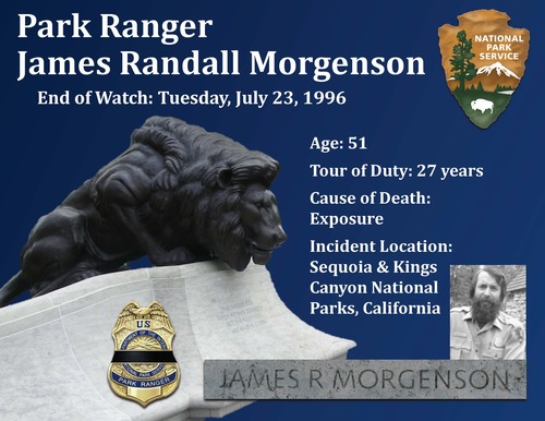 "Ranger James (Randy) Morgenson drowned after being swept over a waterfall while on a backcountry patrol in Sequoia-Kings Canyon National Park, California. Other rangers began to search for him after he failed to check in with dispatch at the regular time following the first day of the patrol. Despite an exhaustive search, his remains were not found until July 2001, nearly five years after he went missing. The investigation indicated that he likely fell through a snow drift and broke his leg while crossing a creek, dying of associated injuries and hypothermia. His remains were washed down the creek and into a small cascade where they were hidden in the rocks for years. Ranger Morgenson had served with the agency for 27 years. He was survived by his wife." www.odmp.org/officer/16221-park-ranger-james-randall-randy-morgenson