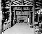 VIEW FROM THE FRONT ENTRANCE ENTRANCE PAST THE FRONT DESK (L) AND NORTH ACROSS THE LOBBY TO THE FIREPLACE. CIRCA 1936. SANTA FE RR PHOTO - 09684
