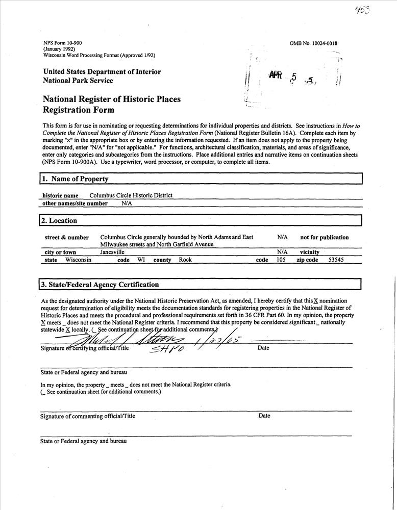 Janesville ; Columbus Circle generally bounded by N. Adams and E. Milwaukee Sts. and N. Garfield Ave.