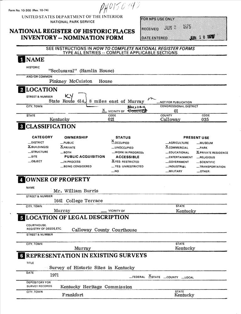 Murray ; 8 mi. E of Murray on KY 614