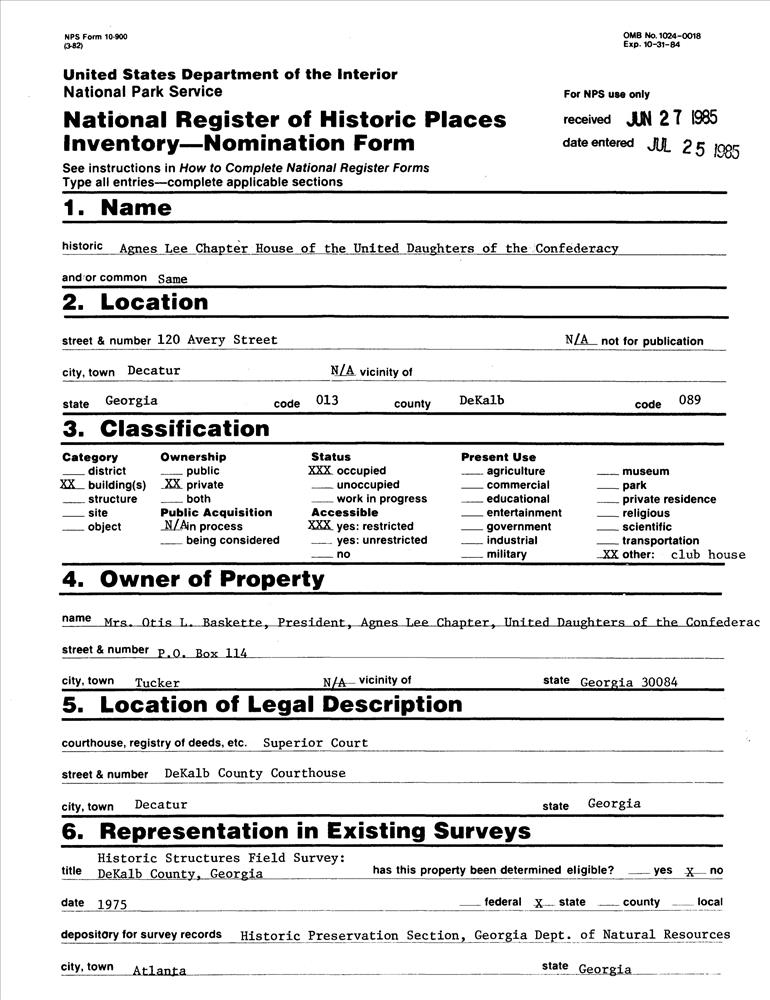 Lee, Agnes, Chapter House of the United Daughters of the Confederacy