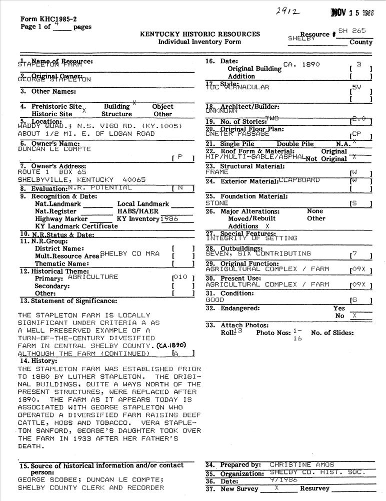 Bagdad ; KY 1005/Vigo Rd., .5 mi. E of Logan Rd.