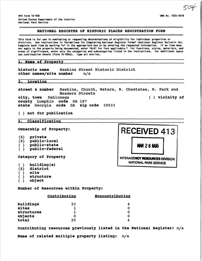 Dahlonega ; Roughly, Hawkins St. from Church St. to N. Meaders St., including adjacent parts of Water, N. Chestatee and N. Park Sts.