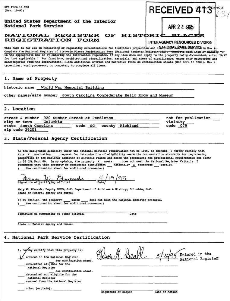 920 Sumter St., at jct. with Pendleton St.