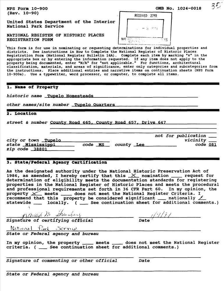 Tupelo ; Co. Rds. 665 and 657 and Co. Dr. 647, S of jct. with the Natchez Trace Parkway
