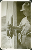 This is an historic black and white photograph from the Scotty's Castle Historic Photograph Collection, Death Valley National Park of a middle-aged man holding several dead ducks by the neck. Man has peaked cowboy had, buttoned shirt, and jeans. He is standing in large open doorway of large building. Wagon wheel behind man inside building. Number in black ink in lower left corner.