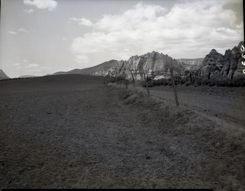 Improper land use, type of fence construction, and typical grazing available, section 16. ; ZION Museum and Archives Image 101.01.008 ; ZION 8274