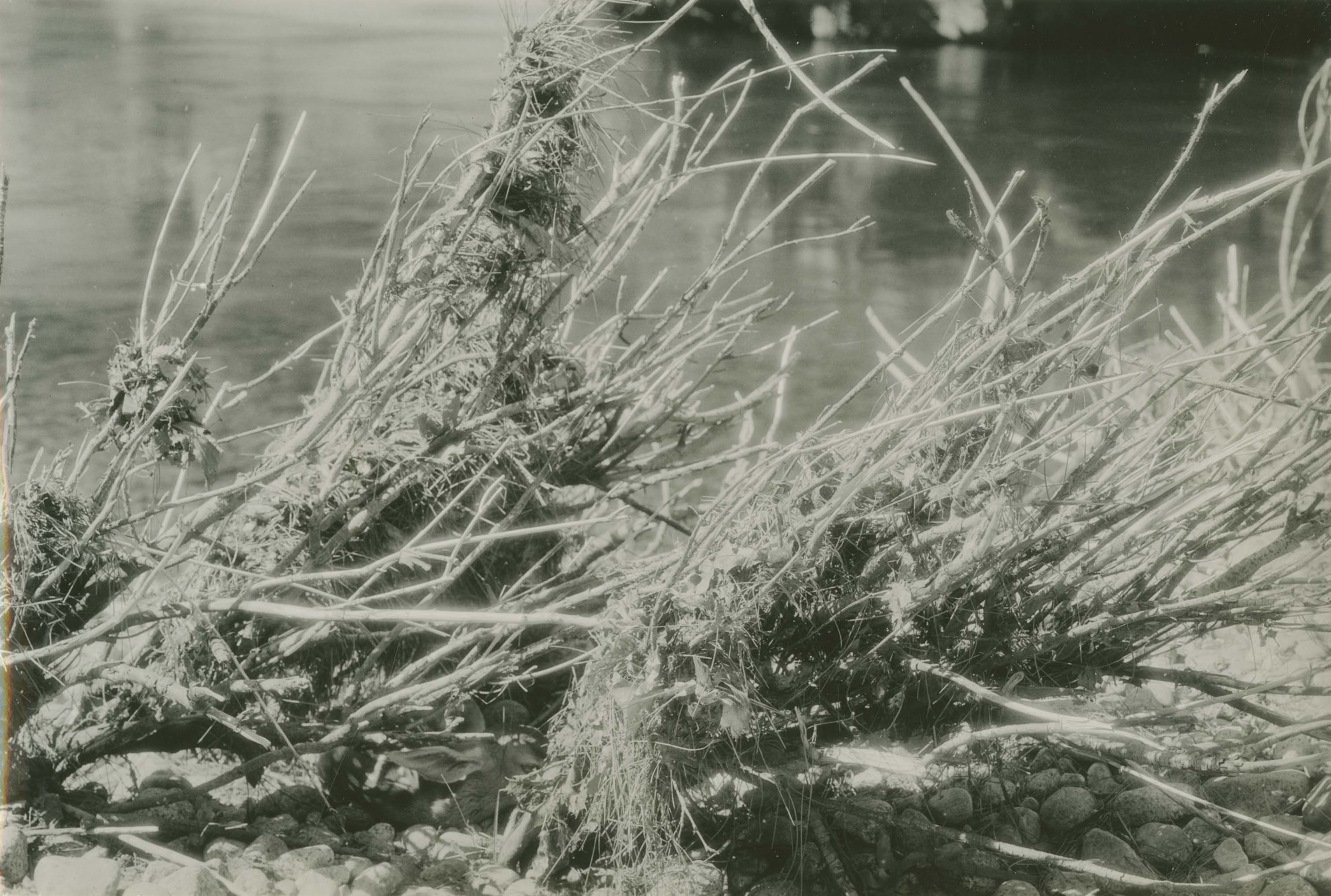 California Mule Deer. Close-up of hiding place in driftwood of day-old fawn. Locality: Yosemite National Park. Negative #: 182. Location of Negative: Region Four Headquarters. [This information comes from the reverse of the envelope for this negative number.].