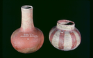 Two jars, one long necked, one wide mouthed with red and white stripes.