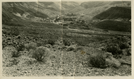 Death Valley Ranch looking east over Scotty’s Caste Main House and Annex, Cook House, Hacienda, Garage, Long Shed and Bunkhouse, and Stables. Circa December 1927. Image taken on hillside west of developed area showing desert landscape and hills rising around Death Valley Ranch complex. Bonnie Clare Road enters from the right (south) continuing around complex and east up the canyon. Black and white, horizontal format. Inscription in black ink on reverse: Looking up the valley toward Bonnie Clare showing the whole thing. Inscription probably by Hale Daggett, a carpenter at Death Valley Ranch. Printed several times in black on reverse: Velox.