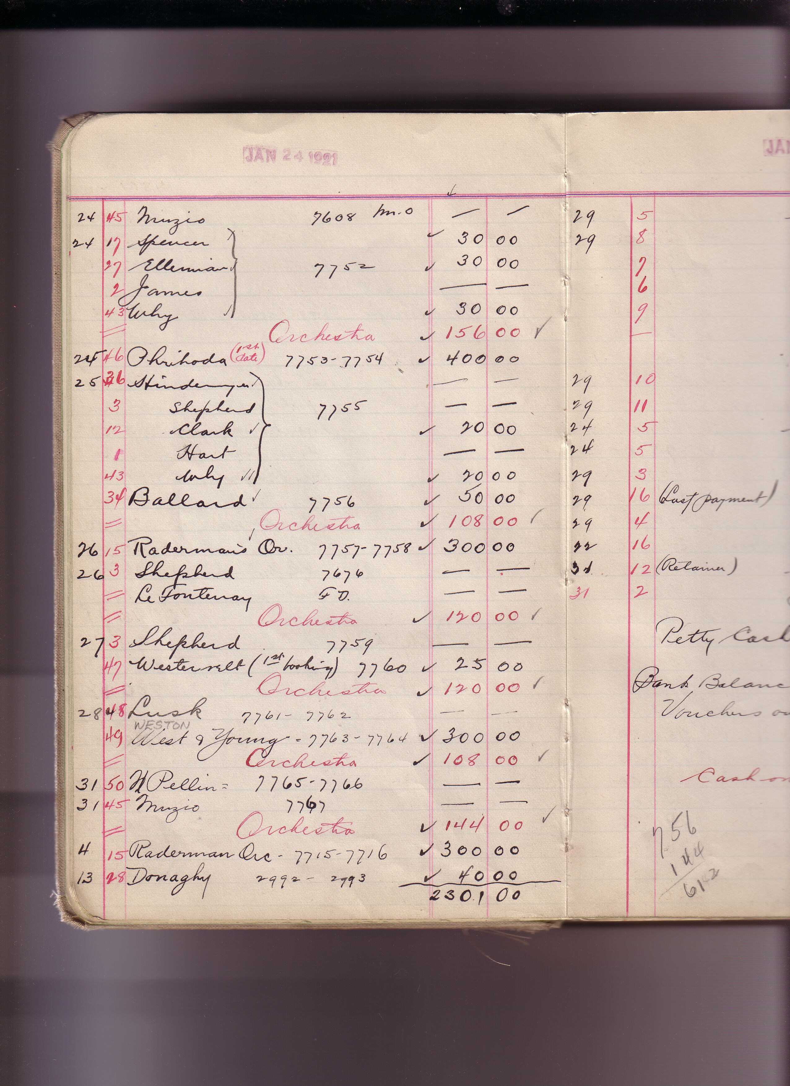 Some of the markings made in pencil in these cash books were made by ENHS Curator Leah Burt during the 1970s and/or early 1980s. For Leah Burt handwriting examples see pages for: December 19, 1921 (cash book 17) ; February 12, 1923 (cash book 17) ; October 27, 1924 (cash book 18) ; December 01, 1925 (cash book 19).