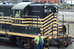 two employees waiting for instruction. one is standing in front of train, the other is up in the cab, peeking out the window