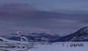 Sun is shining on snow covered mountains creating a pink glow on the top of the peaks.