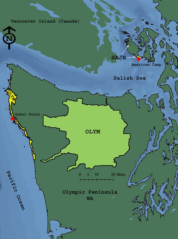 Location of OLYM on the Olympic Peninsula and SAJH in the Salish Sea of Washington. The coastal strip of OLYM and the American Camp unit of SAJH are highlighted in yellow. Red diamonds denote proposed location of OA research and current locations of NCCN I&M rocky intertidal community monitoring.