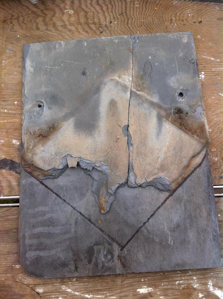 The mansard slate roof of the National Cemetery Lodge exhibits cracked, damaged, or missing slate on 15 percent of the roofs surface. The photos of this project depict the damaged shingles, and the method of repair.
