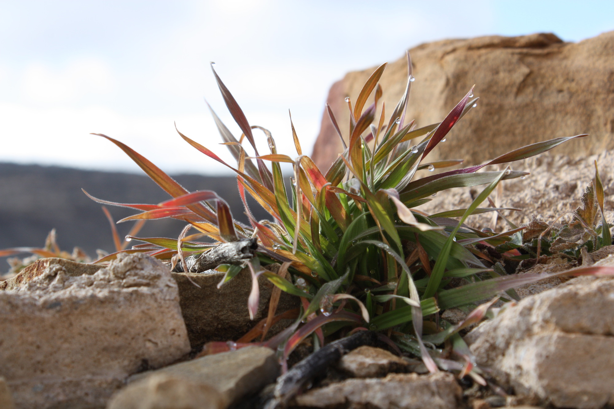 A red and green grass found growing among rocks at CHCU in January of 2017. This photo was taken by Hillary Grabowska of NPS.