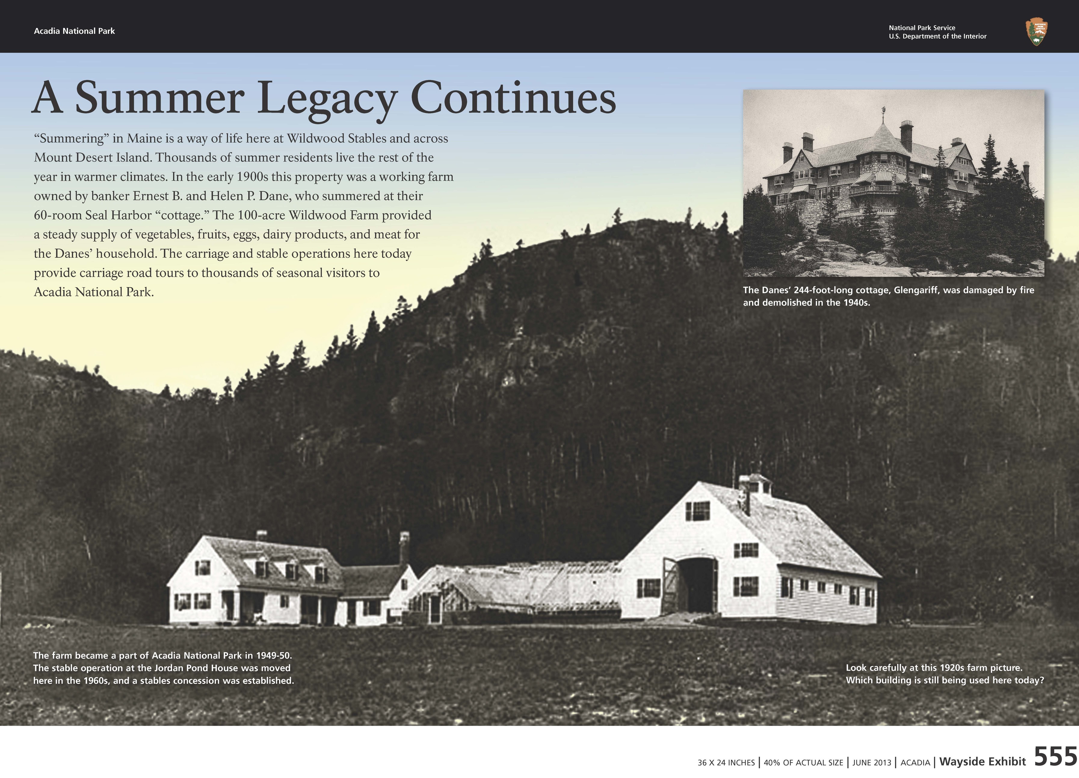 “Summering” in Maine is a way of life here at Wildwood Stables and across Mount Desert Island. Thousands of summer residents live the rest of the year in warmer climates. In the early 1900s this property was a working farm owned by banker Ernest B. and Helen P. Dane, who summered at their 60-room Seal Harbor “cottage.” The 100-acre Wildwood Farm provided a steady supply of vegetables, fruits, eggs, dairy products, and meat for the Danes’ household. The carriage and stable operations here today provide carriage road tours to thousands of seasonal visitors to Acadia National Park.