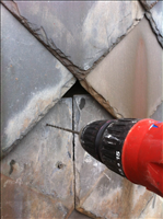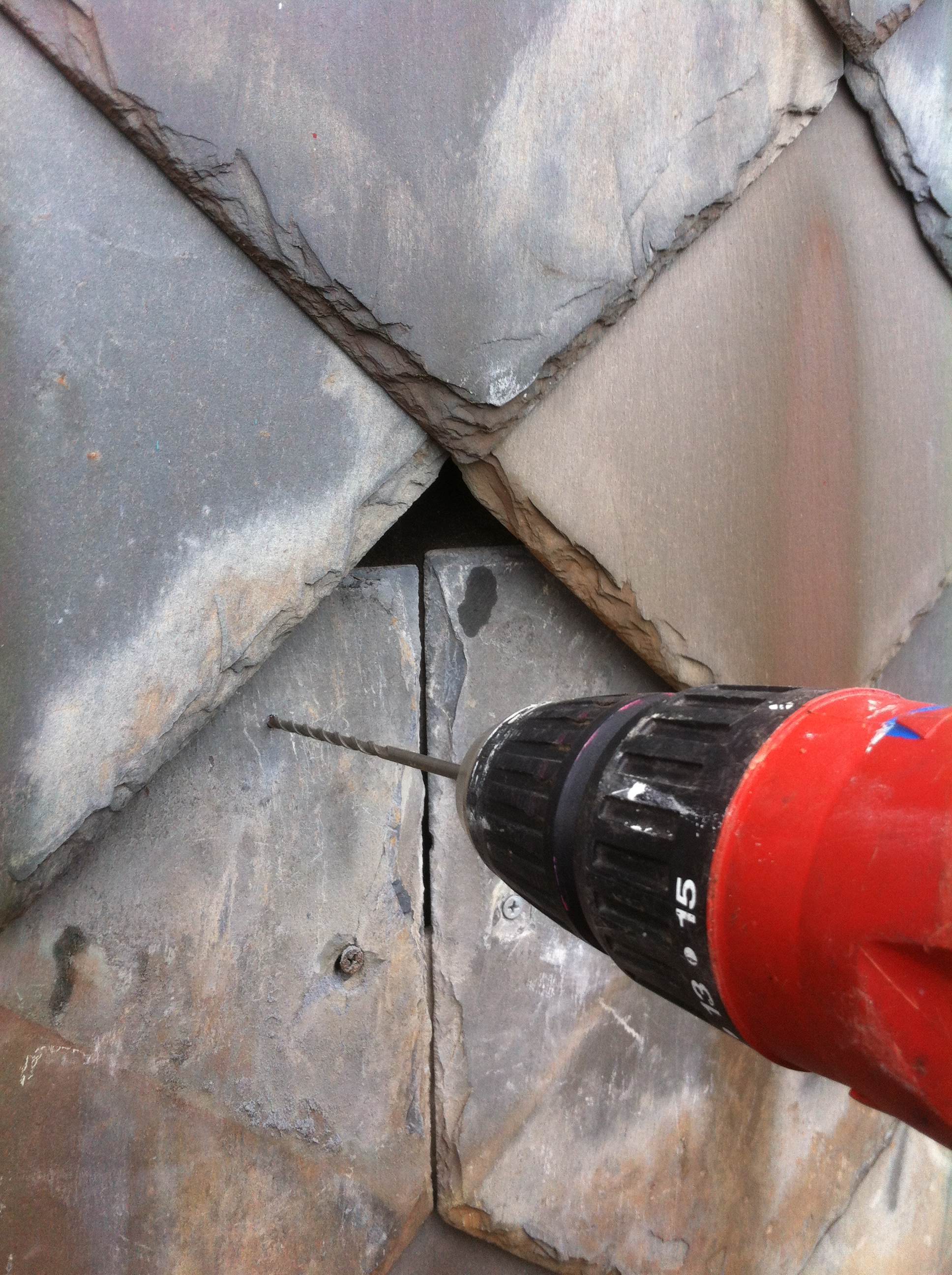 The mansard slate roof of the National Cemetery Lodge exhibits cracked, damaged, or missing slate on 15 percent of the roofs surface. The photos of this project depict the damaged shingles, and the method of repair.