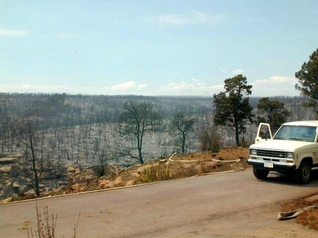 Forest burn areas depicted in surface photos in the aftermath of the Long Mesa Fire, Mesa Verde National Park, August 2002