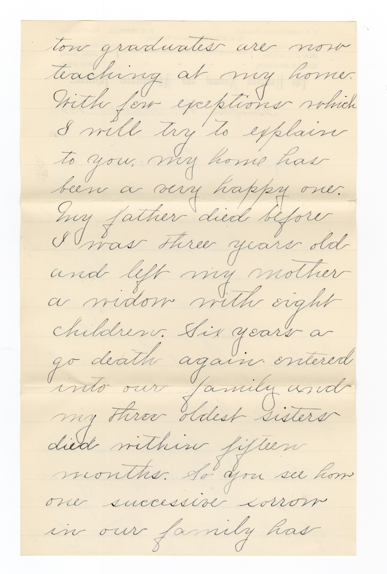My home is in Salem, New Jersey we live in a nice part of the town. Three Hampt- [p. 2] ton graduates are now teaching at my home. With few exceptions which I will try to explain to you, my home has been a very happy one. My father died before I was three years old and left my mother a widow with eight children. Six years ago death again entered into our family and my three oldest sisters died within sisters died within fifteen months. So you see how one successive sorrow in our family has [p. 3] followed an other leaving us sad indeed. Before I came to this school I worked to help aid my mother. After my fathers death she worked very hard for to support us children who was not large enough to earn our own living. An now I help her all that I can and feel it to be a very little when I look back over my past life and [p. 4] think how much she has done for me. Before coming to Hampton I had not attended school for six years. The school house was frame had one room blackboards was on two sides of the room, a chart hung on one side and a map of the United States hung on the other side of the room. The room was heated by a coal stove and it would seat about seventy five pupil. I came here through a Hampton [p. 5] graduate who is now teaching at my home and has been for the past four years. I also came here hoping to educate my self, so that I may work and teach among my people. I am so glad that the Lord seen wise an just for to spare Gen. Armstrong. My most earnest wish wish [sic] is that Gen. may be spared for many years more. I have thought [p. 6] again an again what would become of this school with out him.