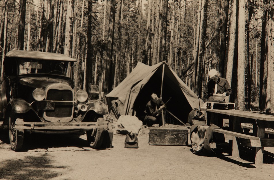 Visitors pitching a tent in Fishing Bridge Auto Camp in Yellowstone National Park.