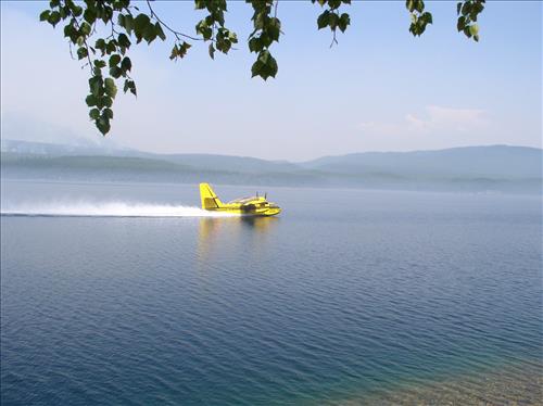 Airtankers are used to fight large fires. The CL-215 is a large, Canadian-built amphibious aircraft that skims the surface of a lake scooping up water to drop on the fire. This aircraft belongs to the Minnesota Department of Natural Resources.