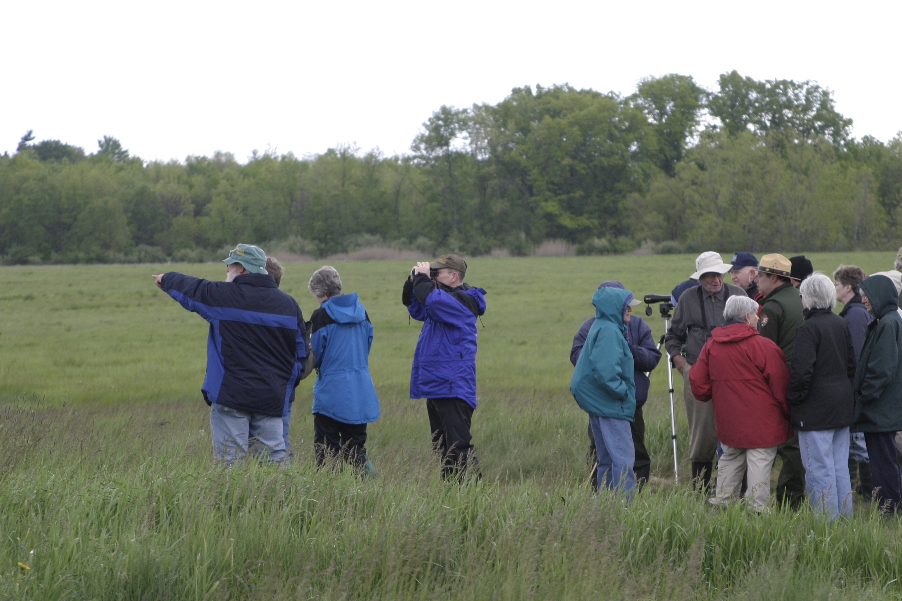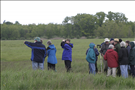 Cuyahoga Valley National Park is designated an Important Bird Area by the Audubon Society of Ohio, in part because of the restored grasslands at the site of the former Richfield Coliseum. A property once known for its sports/concert arena is now managed by the National Park Service as a grassland for rare birds. Cuyahoga Valley National Park offers year-round programs on bird watching. || Visitors bird watch with Park Ranger Paul Motts at an interpretive program called After the Coliseum in 2006. The program was an opportunity for local residents to learn how the park intends to manage this newly restored property.
