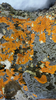 dark rock covered in large patches of orange and light green lichen