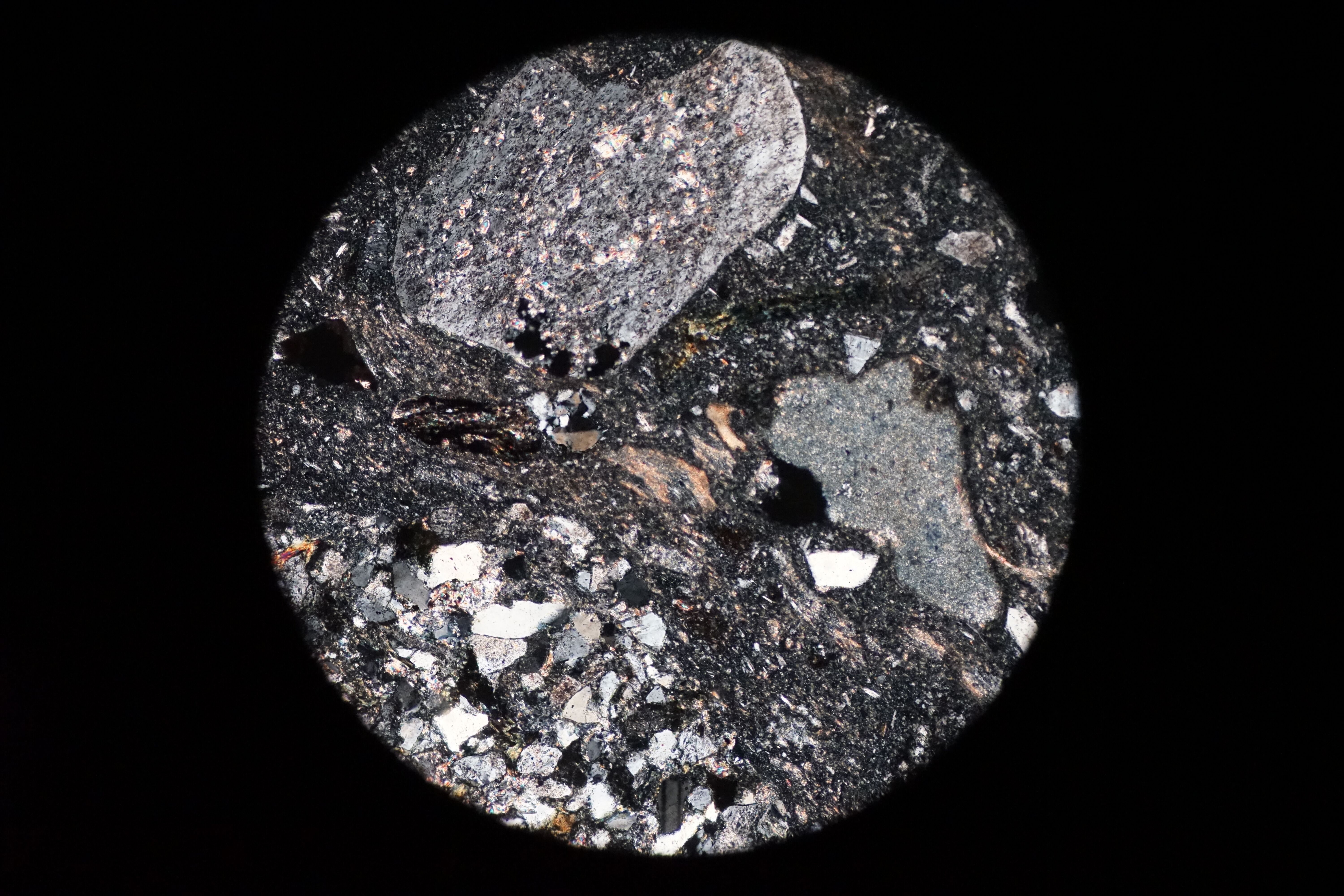 Circular microscopic image of rock structure.