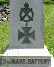Marks position held by 3rd Massachusetts Battery on July 2, 1863. 1 of 25 mns in Park to Massachusetts commands. Located at corner of Althoff Lane and Wheatfield Rd. near Plum Run Valley. || Mn & 2 cannons. Base, 3'6" square. Shaft, 1'10" square, topped w/ 4 polished granite balls. All 6'8" high. Shaft inscribed on all faces, polished insignia of V Corps & artillery on S face. Raised letters on S face. Flanked by 2 Napoleon guns.