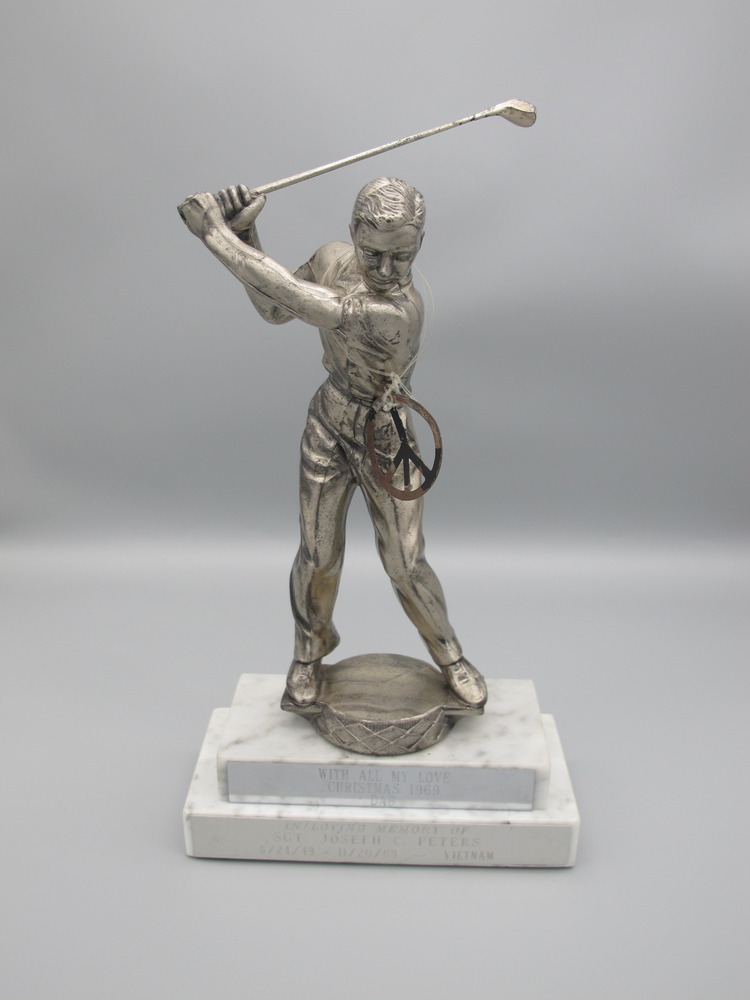 Trophy of a male figure holding a golf club in mid-swing. Figure is standing on a two-tiered marble base. Inscribed plates on the base say "In Loving Memory of Sgt. Joseph C. Peters, 6/24/49 - 11/20/69, Vietnam" and "With All My Love, Christmas, 1969, Dad".