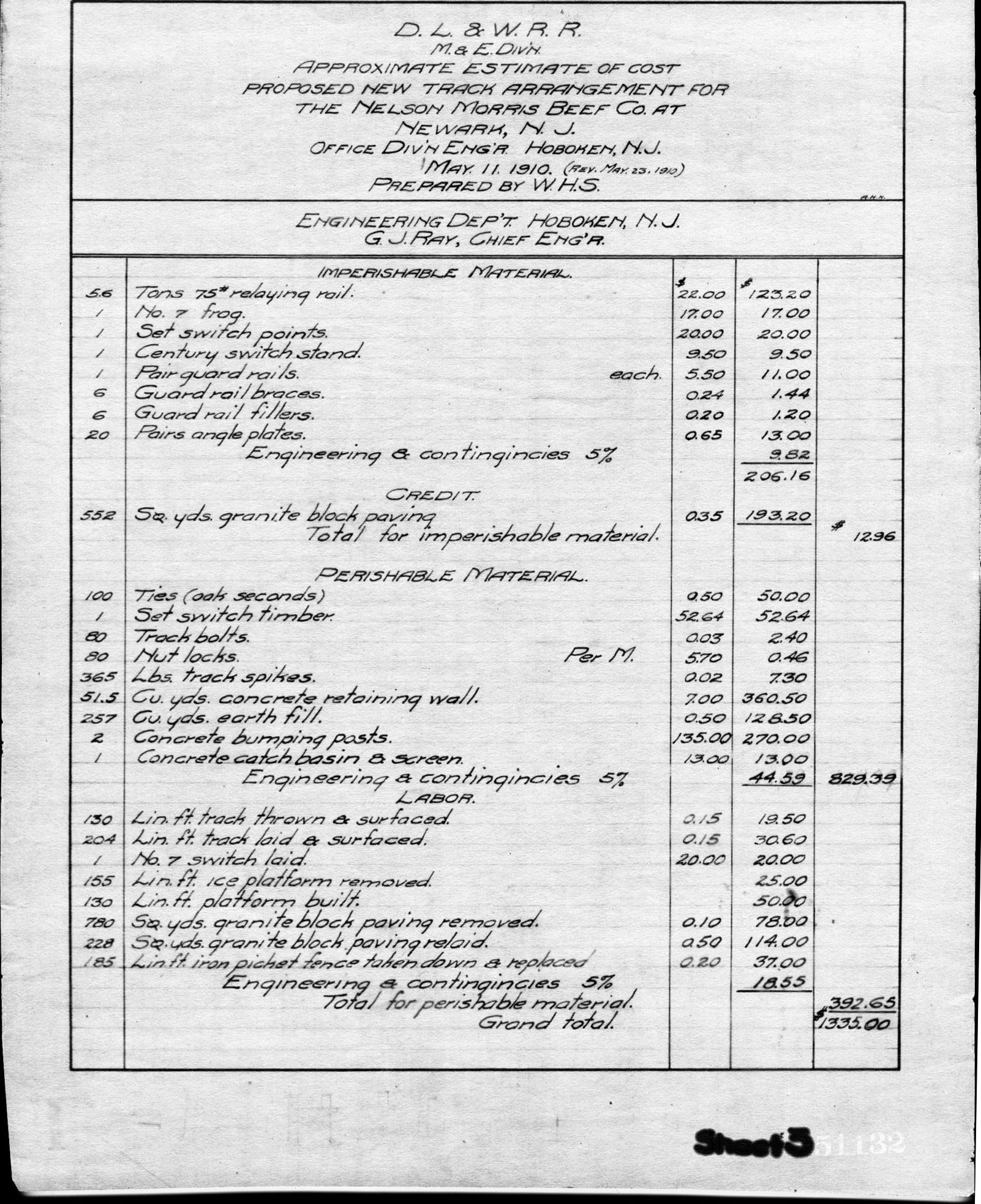 51132.BA#001--Approximate estimate of cost proposed new track arrangement--Nelson-Morris Beef Company--Newark, NJ [1910.05.23]