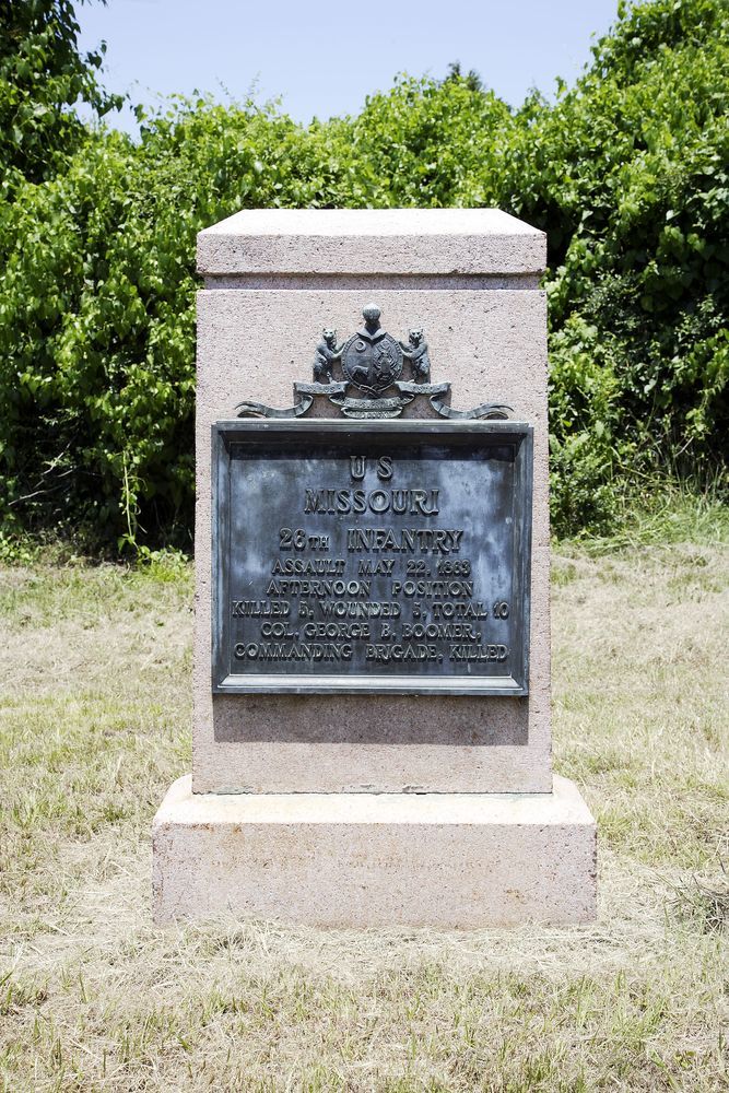 3' x 1'2" x 5', this red Missouri granite marker has a base & a rectangular shaft. On face is a rectangular bronze inscription tablet topped by a bronze Missouri coat of arms. Top has horizontal grooved channel and ends in bevel.