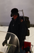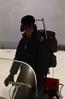 NPS employee kneeling on a ski mobile in Yellowstone National Park.