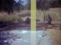 Man standing by as the roofing cart is filled with roofing materials during the headquarters/visitor center roofing project. ; ZION Museum and Archives Image 004.01.06-11of22 ; ZION 15933
