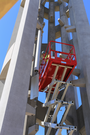 Man in hard hat on a red lift examines a long metal chime tube hanging in tall tower with many windows.