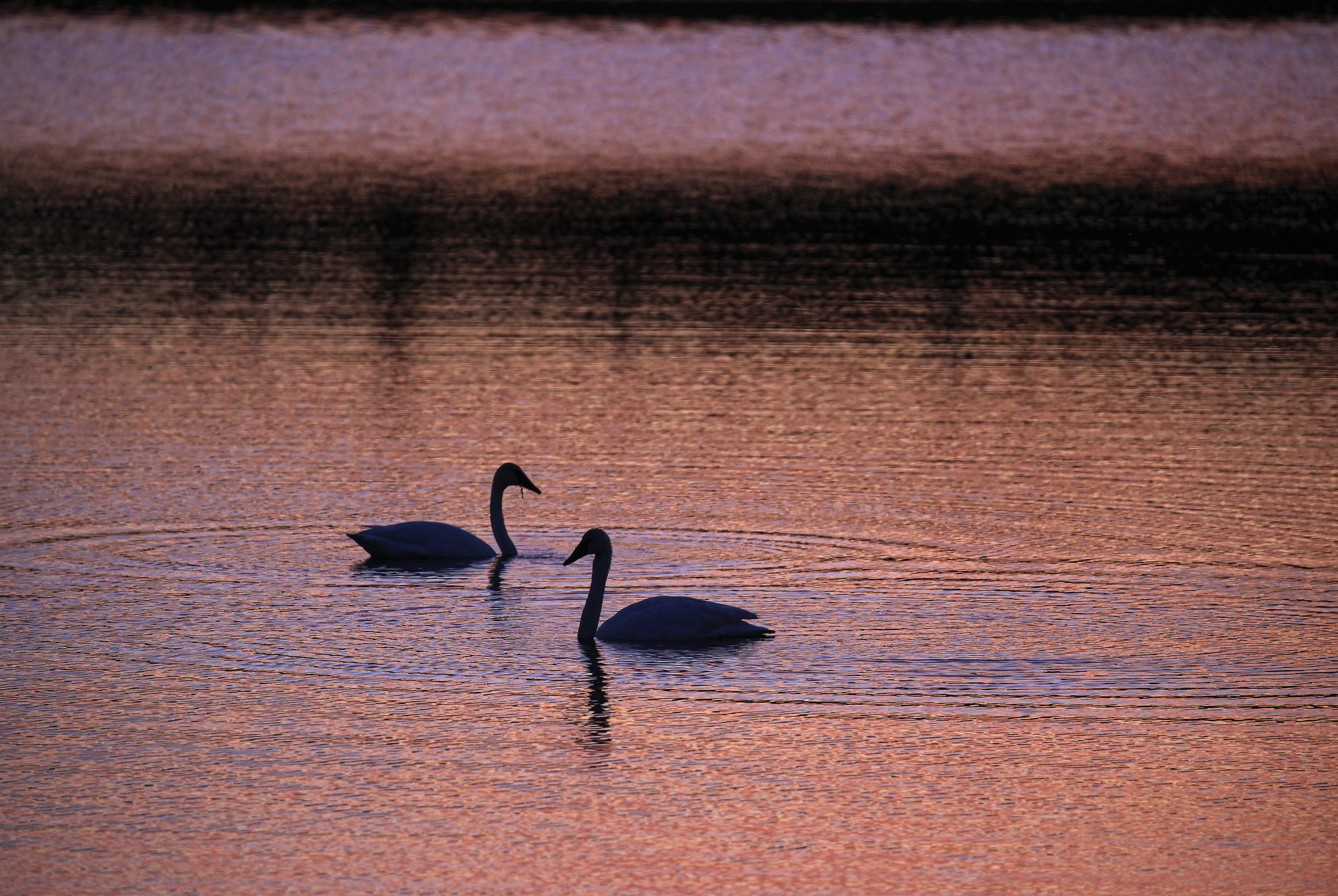 Two swans swim and eat in a kettle pond near Wonder Lake in late June, 2017.