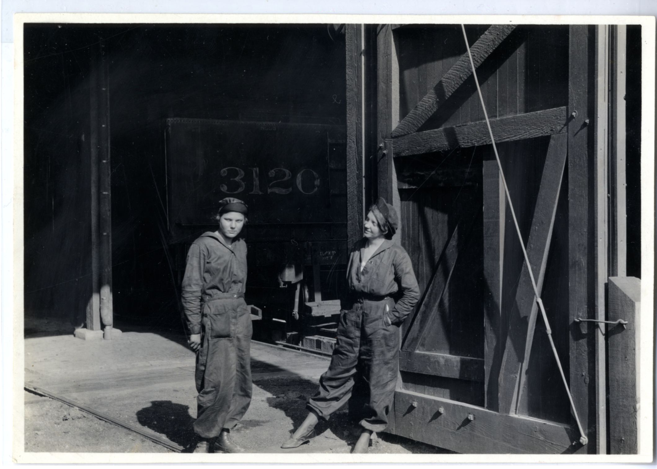 LIBI_00312_10935; Photograph in full length view, informal pose. The image depicts two women in cover-alls/jumpsuits and caps. They stand in the open doorway of a large wooden structure. Railroad car 3120 is visible in the background. The women work as engine wipers for the GB & QRR [Greater Burlington and Quincy Railroad?] in Greybull, Wyoming. Handwritten notation by Camp on the verso reads: “Women Engin Wipers, GB.+Q.R.R. Greybull, Wyo. June 1918. The image was taken by an unknown photographer on an unknown date. This may be the original image. ; photograph;Courtesy of the National Park Service, Little Bighorn Battlefield National Monument, LIBI_00312_10935, Unknown Photographer, "Women Engine Wipers in Greybull, Wyoming," June 1918.